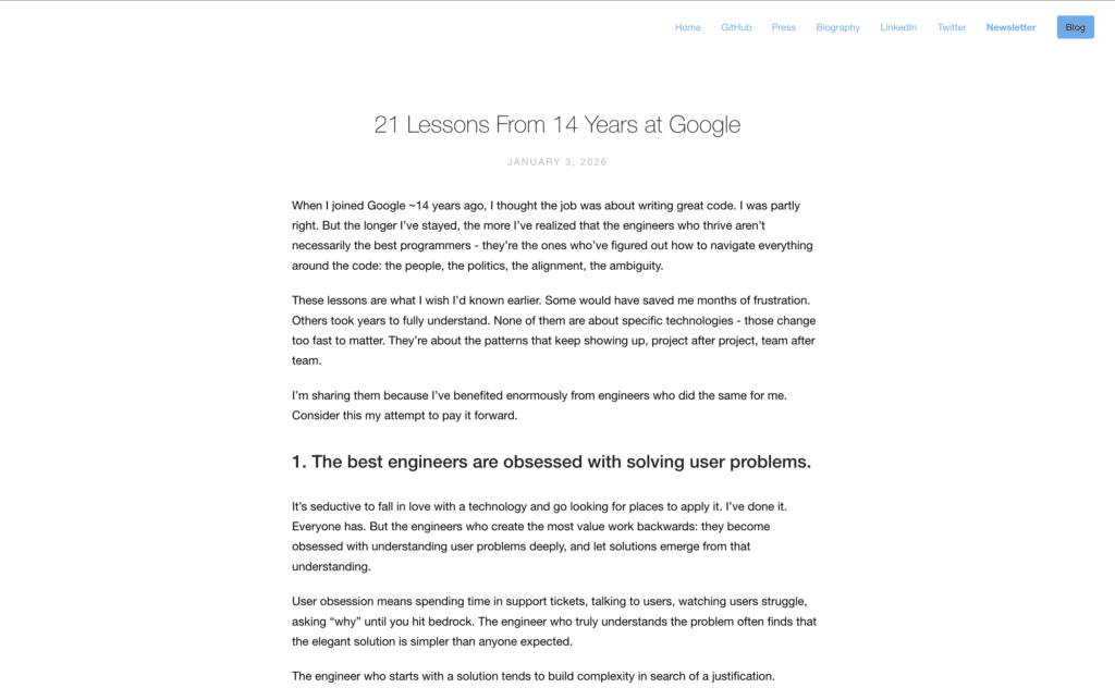 Addy Osmani reflects on 14 years at Google, emphasizing that engineering is primarily about people and user problems rather than just code. He argues that technical cleverness is often a liability because it creates maintenance overhead and reduces system clarity.